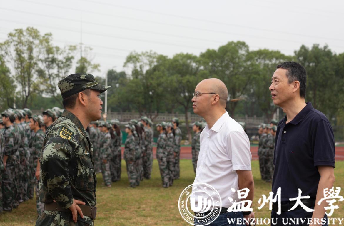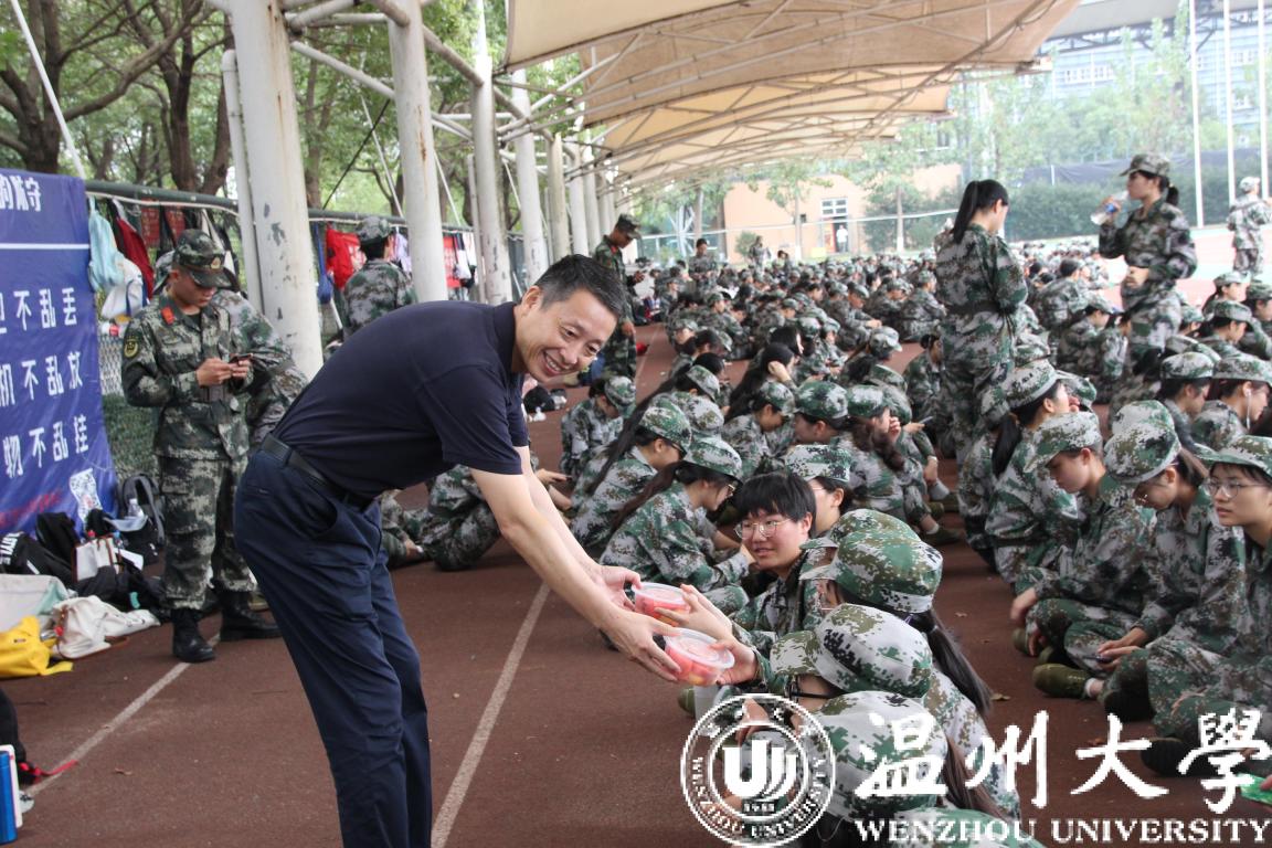 10月12日上午,院长王宗正、党委书记林钦在北校区运动场慰问承训教官与2019级全体军训新生。