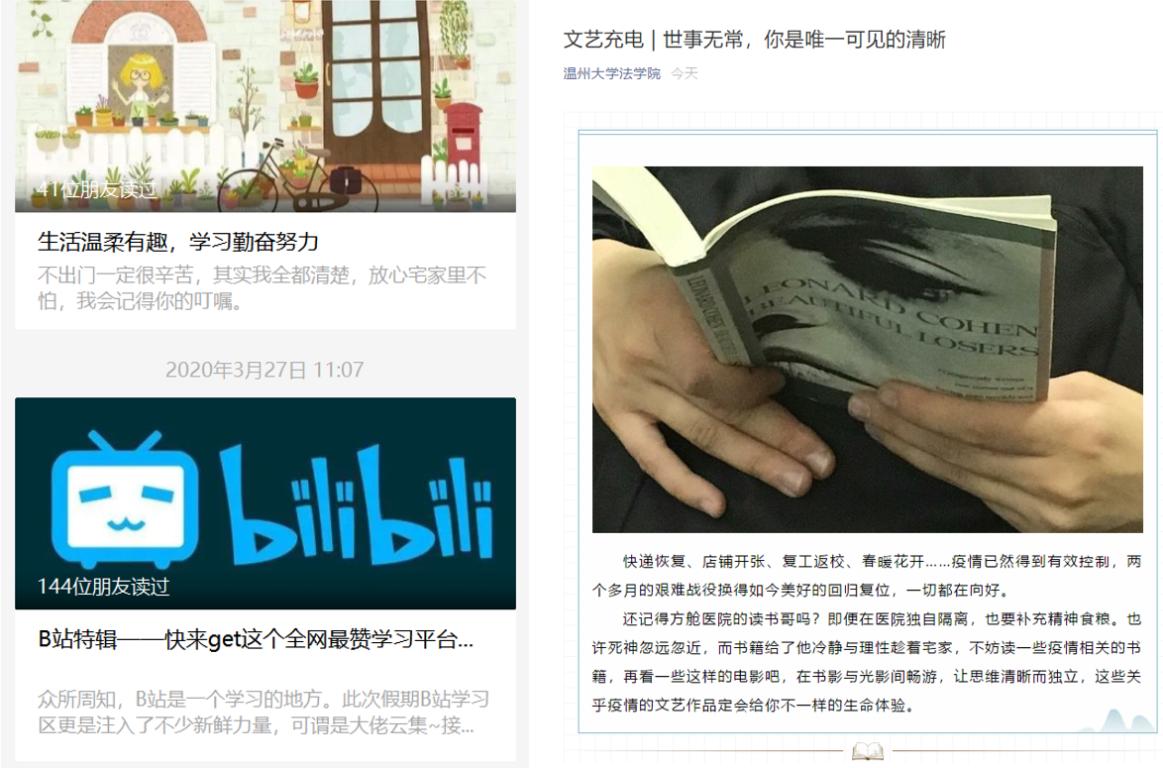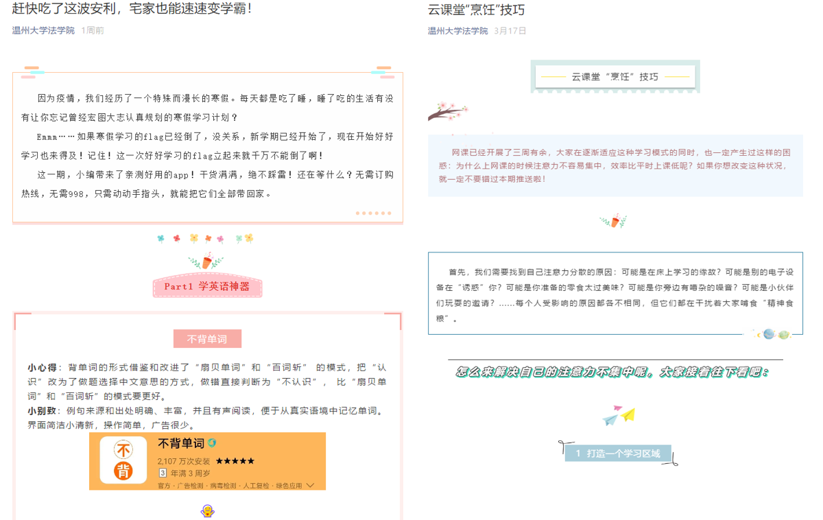 “晒”书桌笔记,推送宅家学习“大曝光”系列,展示“最美学习笔记”、“最美学习书桌”,让学生感兴趣为起点,以“有用+有趣”作为学生产生兴趣的切入点,引导学生以健康向上的面貌投入线上学习。制作“学霸来了”网络学风建设专栏,“晒”出优秀学子网课学习心得,引导全体学生养成自律习惯,营造“比学赶帮超”的良好氛围。