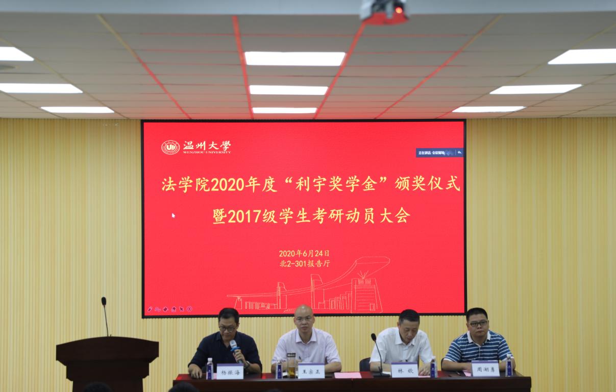 6月24日下午,麻将胡了试玩 2020年度“利宇奖学金”颁奖仪式暨2017级学生考研动员大会在北2-301报告厅举行。本次会议采用线上线下同步进行。院长王宗正、党委书记林钦、副书记杨振海、副院长周湖勇、学工办辅导员、2020届考取研究生学生代表、2017级学生、2018级考研学生代表参加现场会议,其余学生通过视频直播方式参加线上会议。大会由党委副书记杨振海主持。
