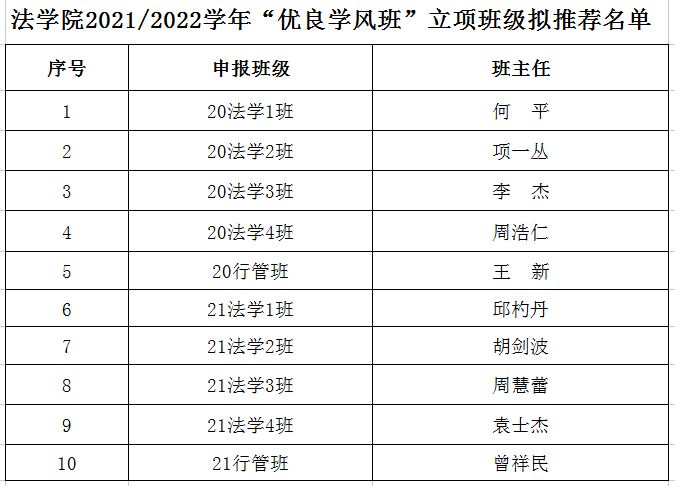 根据温州大学2021/2022学年“优良学风班”立项申报工作的通知要求,经班级申报、麻将胡了试玩 初步审核,现决定对20法学1班等10个班级进行立项拟推荐,现将结果予以公布。公示期为2022年3月22日-3月28日,联系地址:麻将胡了试玩 一楼事务大厅,联系人:谢老师,联系电话:0577-86680919。
