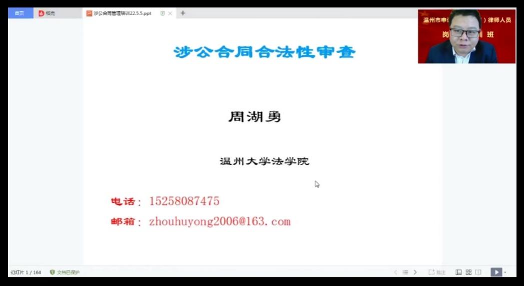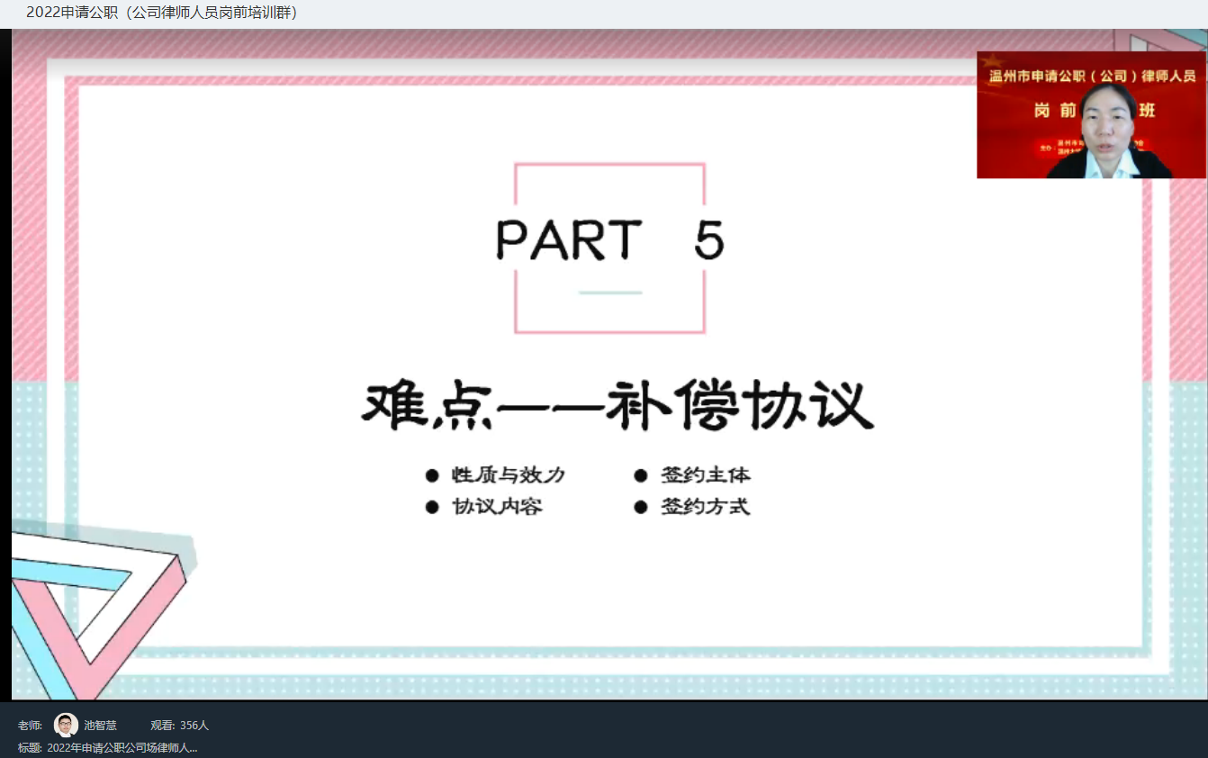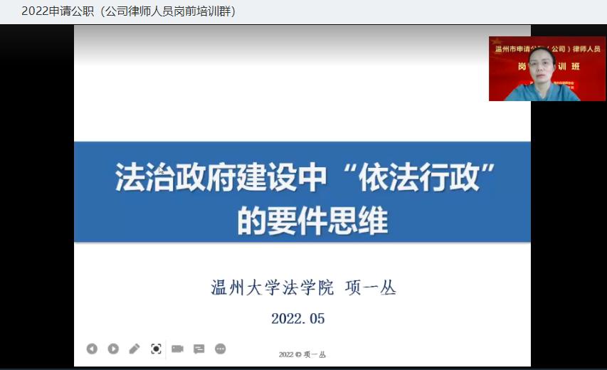 5月5日至5月7日,温州市司法局、温州市律师协会、麻将胡了试玩(中国)官方网站 和瓯越律师麻将胡了试玩 联合举办了2022年温州市申请公职(公司)律师人员岗前培训班。本次培训通过钉钉软件以在线直播方式开展,全市符合申请公职(公司)律师条件的人员共400余人参加。