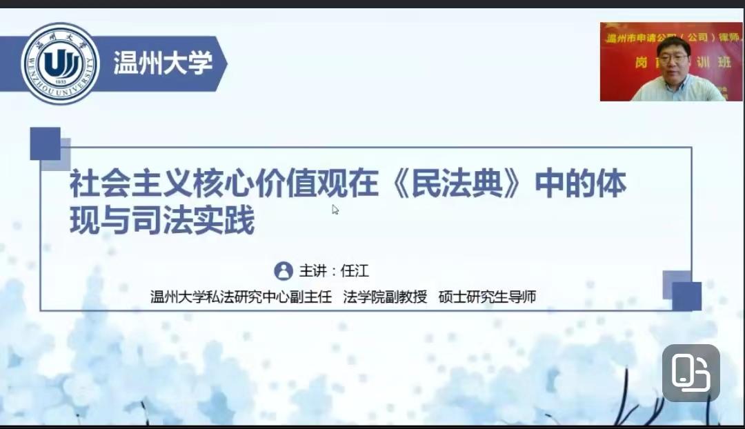 麻将胡了试玩(中国)官方网站 任江副教授主讲《社会主义核心价值观在<民法典>中的体现与司法实践》。