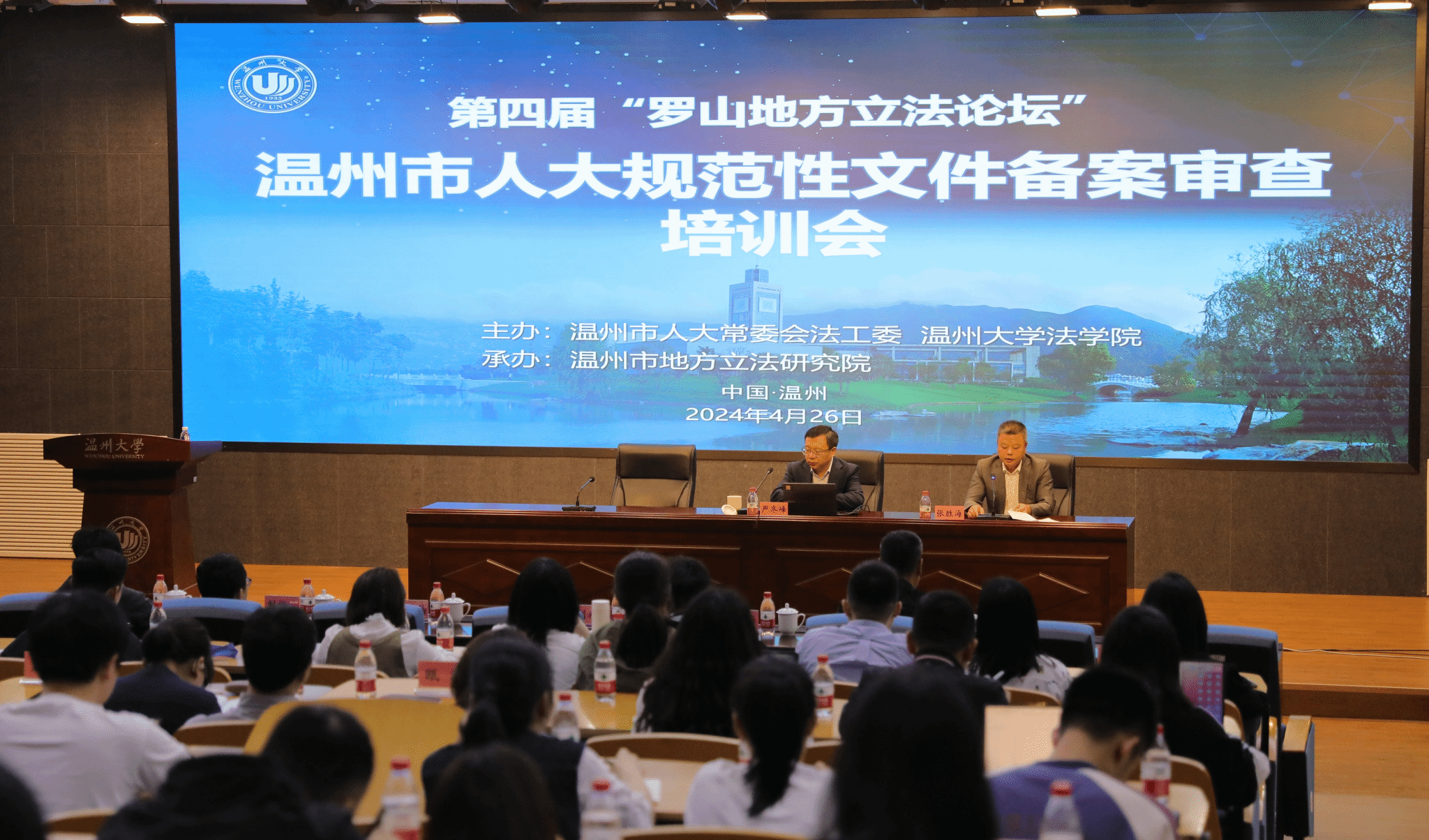 4月26日,由温州市人大常委会法工委、麻将胡了试玩(中国)官方网站 主办,温州市地方立法研究院承办的第四届“罗山地方立法论坛”暨规范性文件备案审查培训会在温州大学南校区岩松堂步青厅隆重举行。