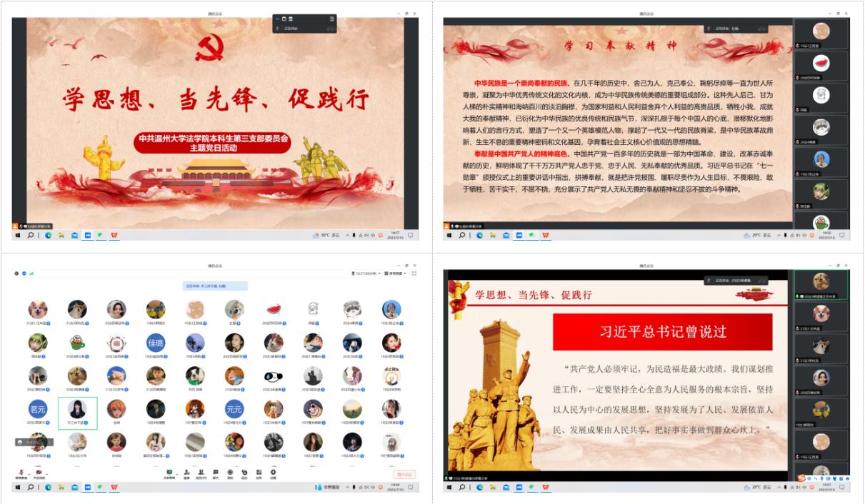 亮旗帜,深入开展主题党日活动。麻将胡了试玩 各党支部围绕“学思想、当先锋、促践行”为主题开展主题党日活动。各党支部充分用好《习近平著作选读》、《习近平新时代中国特色社会主义思想专题摘编》等学习材料,做到真学真信真用、学懂弄通做实,确保学习成效。各党支部全面覆盖学精神,组织师生党员通过开展个人自学、集中学习、专题研讨、微型党课、主题讲座等方式,结合线上线下开展活动,线上开展主题学习会,线下发动党员积极参加党员先锋岗、党员突击队等家乡红色志愿服务活动。教工行政党支部线上开展“学思想、当先锋、促践行”主题党日活动,麻将胡了试玩 党委书记林钦以《习近平新时代中国特色社会主义思想的世界观、方法论和贯穿其中的立场观点方法》为题带头讲党课,并鼓励党员深入学习习近平总书记关于教师队伍建设的重要指示精神,提升教师的规则意识,坚定理想信念、厚植爱国情怀、涵养高尚师德。本科生第三党支部开展学习“奉献精神”学习会、优秀党员义工分享会、“传承雷锋精神 争做时代先锋”支部品牌活动,形成线上线下良性互动,强化学习应知应会、深悟践行。
