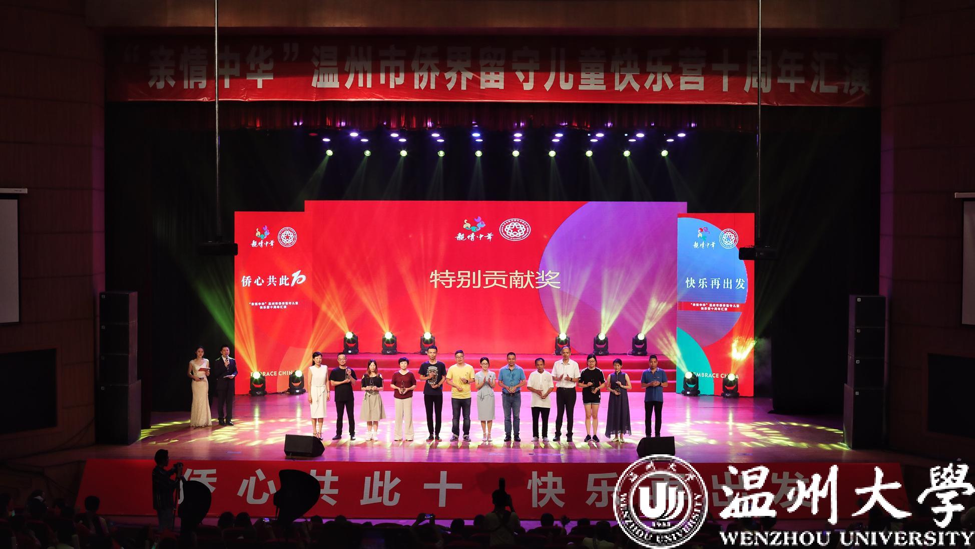 7月28日下午,“亲情中华”温州市侨界留守儿童快乐营十周年汇演在温州大学育英大礼堂举行,侨联各级领导、各方代表、历届快乐营志愿者代表和第十季快乐营的小营员们欢聚一堂。
