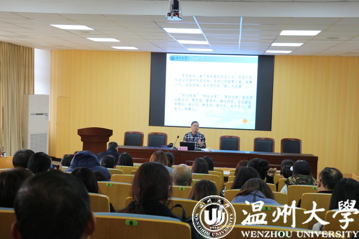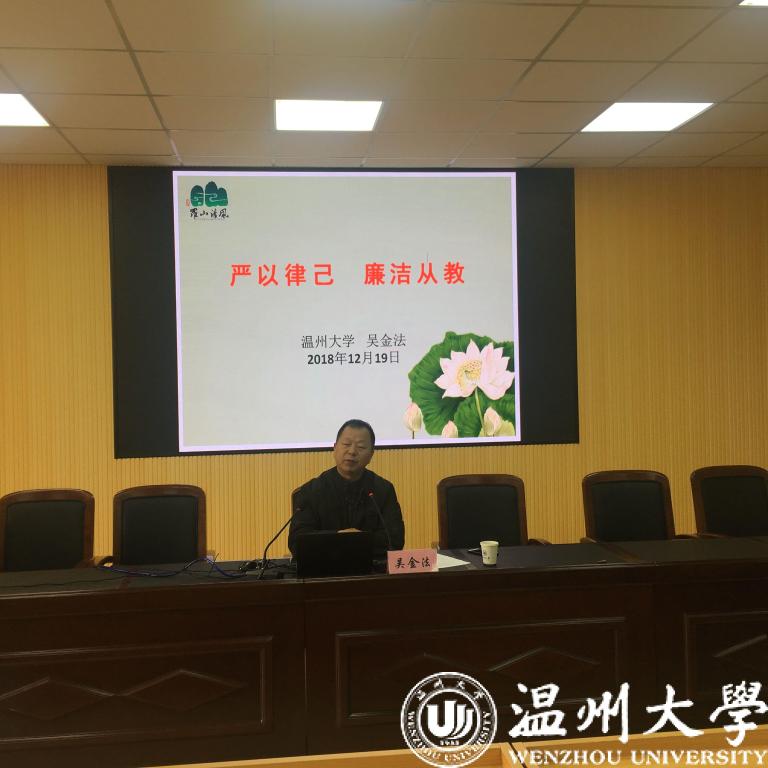 2018年12月19日下午,麻将胡了试玩 在北校区法政楼301报告厅召开了全院教职工大会和专题政治学习会。校党委委员、纪委书记吴金法做《严以律己,廉洁从教》专题讲座,校党委委员、宣传部长潘玉驹做《牢牢把握意识形态工作领导权主动权》专题讲座。本次讲座由法政麻将胡了试玩 书记林钦主持,保卫处、音乐麻将胡了试玩 与法政麻将胡了试玩 全体教职工及麻将胡了试玩 研究生党员、预备党员及入党积极分子参加学习。
