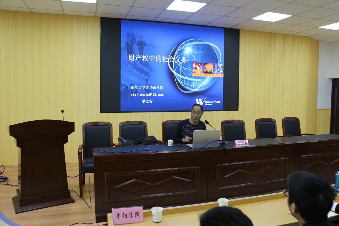 2018年12月14日周五下午1点半,在温州大学法政麻将胡了试玩 301报告厅,浙江大学光华麻将胡了试玩 夏立安教授以《财产权中的社会义务》为主题展开了一场精彩的讲座。本次讲座由王宗正院长主持,有来自包括温州法律实务界的法官、律师、检察官,以及麻将胡了试玩 研究生、本科生等,济济一堂,共享夏立安教授所带来的这场学术盛宴。