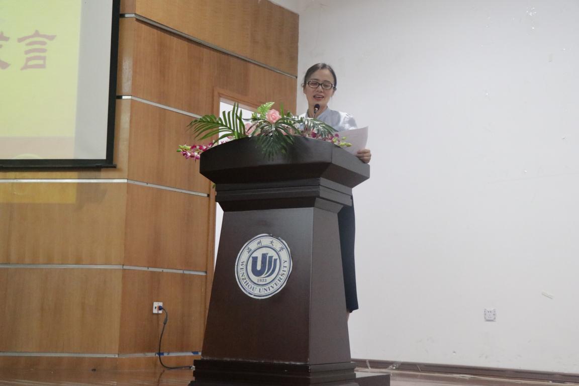 首先,王宗正院长致辞对新生来到法政麻将胡了试玩 学习表示热烈欢迎。王院长在致辞中向新生介绍了法政麻将胡了试玩 的办学历史与特色、特别强调了近几年麻将胡了试玩 在学科建设、人才培养、博硕士点培育和提升以及法政学子获得的各类学业成绩和重大奖项、毕业后的就业质量稳居全校甚至全省前列等业绩。他指出在麻将胡了试玩 的优秀师资和良好文化环境中,新生同学只要努力拼搏,一定不会后悔选择温大法政麻将胡了试玩 这个精英荟萃的"浙南法政类人才的黄埔军校和培养高地",他还对新生入校后的生活和学习适应、学业规划提出了建议。曾获得"温州大学最受学生爱戴老师"称号的项一丛老师代表全院老师对2018级新生的到来表示热烈欢迎,项老师围绕大学生活的新状态和新生应有的求索和担当等学业学风话题娓娓道来,她给新生提出了三点期许:一、新生应该尽快建立迎接挑战和困难的准备及信心;二、新生应该在大学习得优雅生活的能力;三、新生应把训练优秀公民的素养作为目标,项老师富有文采和哲思的发言赢得新生的阵阵掌声。老生代表、院学生会主席宋卓君同学也作了充满激情的发言,表达了作为老生对18级新生的欢迎和法政学子在成长成才方面的朋辈引领和决心。紧接着,“新生抒心声”环节由18级新生代表罗薇、杨钰莹、许桐、车昕、史东煜、鲍寒卉、黄旖宁共同带来新生代表的入学“心声”,他们逐一上台表达了结缘温大、相识法政、努力拼搏、立志成才的决心点,用铿锵的语言说出了法政学子特别是18级新生共同的希望和梦想。随后,全体18级新生全体起立,庄严进行了新生入学宣誓;"一朝法政人,一生法政人",新生入学宣誓许下的是一份承诺,扛起的是全体法政人的责任与担当。最后,法政麻将胡了试玩 学生科科长孙德升老师为大家介绍法政麻将胡了试玩 各学生组织社团的工作品牌,并与大家一同欣赏麻将胡了试玩 宣传片及品牌活动短片,使大家对法政麻将胡了试玩 有一个更为全面的了解。