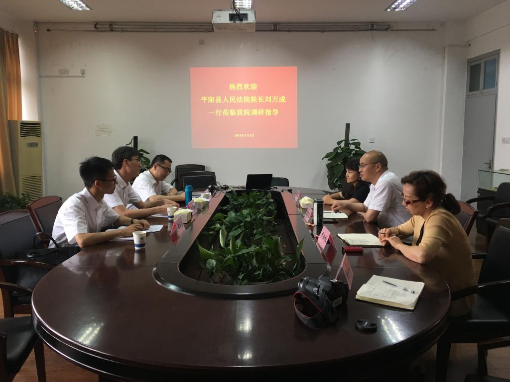 5月9日下午,平阳县人民法院院长刘万成一行来麻将胡了试玩(中国)官方网站 考察交流,王宗正院长、严玲红副书记、法学系何平主任等与来访嘉宾进行座谈,共商高校-实务部门合作事宜。