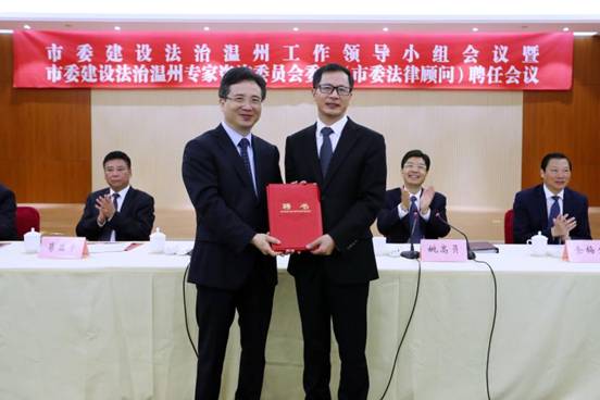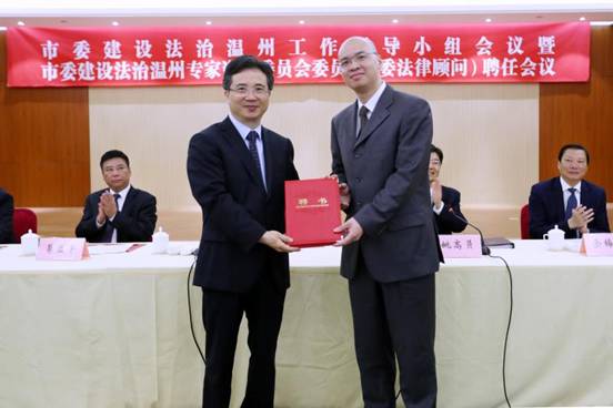 4月4日上午,市委召开建设法治温州工作领导小组会议暨市委建设法治温州专家咨询委员会委员(市委法律顾问)聘任会议,我校副校长方益权教授、法政麻将胡了试玩 院长王宗正教授被聘为市委建设法治温州专家咨询委员会委员与市委法律顾问。