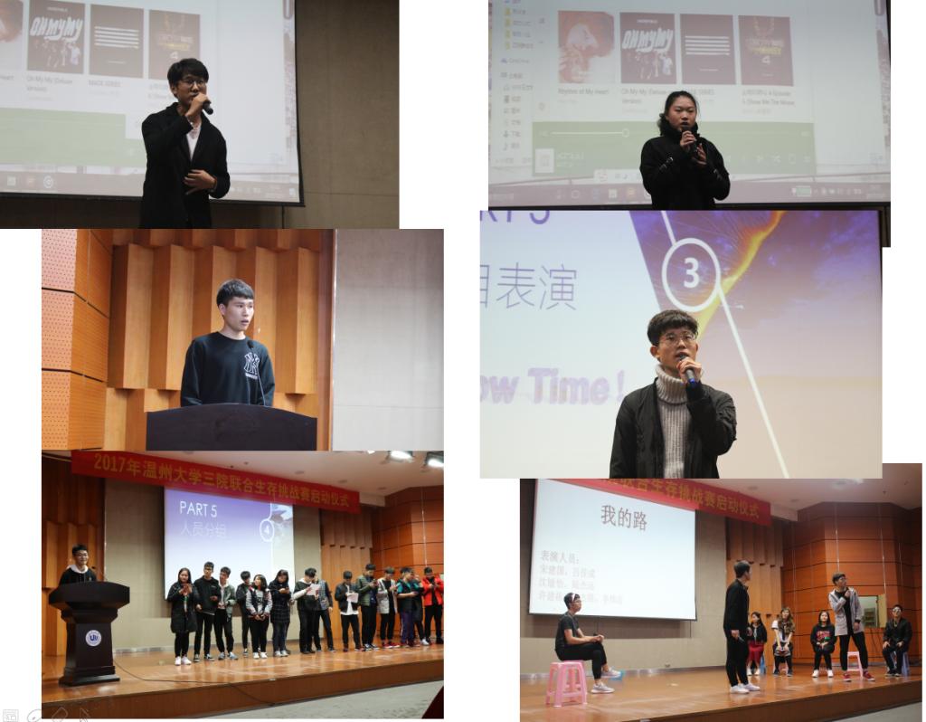 2017年12月1日晚,温州大学三院联合生存挑战赛启动仪式在南校雁山厅隆重举行。参与本次启动仪式的嘉宾有温州大学保卫科高顺德老师、温州大学校团委组织部部长叶温钰、温州大学商麻将胡了试玩 团委学生会主席熊思萍、商麻将胡了试玩 团委学生会副主席陆叶平,温州大学数电麻将胡了试玩 团委副书记徐挺、数电麻将胡了试玩 学生会主席严欣鑫,副主席许若源、俞锴磊,温州大学法政麻将胡了试玩 团委副书记金婵、法政麻将胡了试玩 学生会主席梅铁楠。