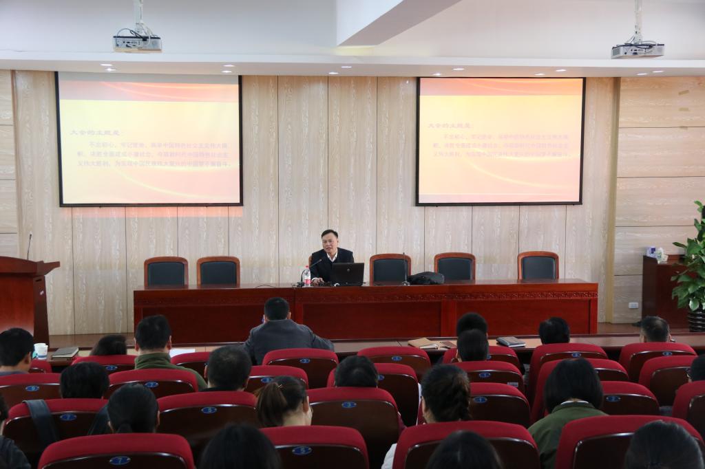 潘部长从详细解读十九大的主题展开:不忘初心,牢记使命,高举中国特色社会伟大旗帜,决胜全面建成小康社会,夺取新时代中国特色社会主义伟大胜利,为实现中华民族伟大复兴的中国梦不懈奋斗。将十九大报告的十三个方面主要内容概括为六个“新”字:新成就、新时代、新使命、新思想、新战略和新担当。潘部长针对这六个“新”做了精读,一是新成就,令人振奋。比如在经济、民生、社会、外交、从严治党等方面;二是新时代,信心满满;三是新使命,斗志昂扬;四是新思想,引领航向;五是新战略,坚定有力;六是新担当,锐气昭昭。同时潘部长又谈及此刻必须要清醒看到,我们的工作还存在许多不足,也面临不少困难和挑战,所以在新时代中国特色社会主义的伟大实践中,要以党的坚强领导和顽强奋斗,激励全体中华儿女不断奋进,凝聚起同心共筑中国梦的磅礴力量。