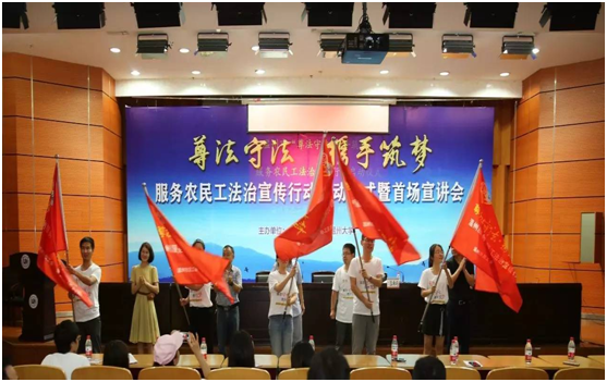 7月28日,温州市"遵法守法•携手筑梦"服务农民工法治宣传行动启动仪式暨首场宣讲活动,在温州大学举行。活动现场,市总工会和温州大学向法治宣传服务队学生代表授旗。市总工会童裳显副主席对活动作了统一安排,并提出了具体的要求。我校法政麻将胡了试玩 16级研究生李勃代表学生讲话。启动仪式后,我校周湖勇博士作了首场宣讲,共有150余名农民工参加此次活动,学校工会副主席张希均主持启动仪式。