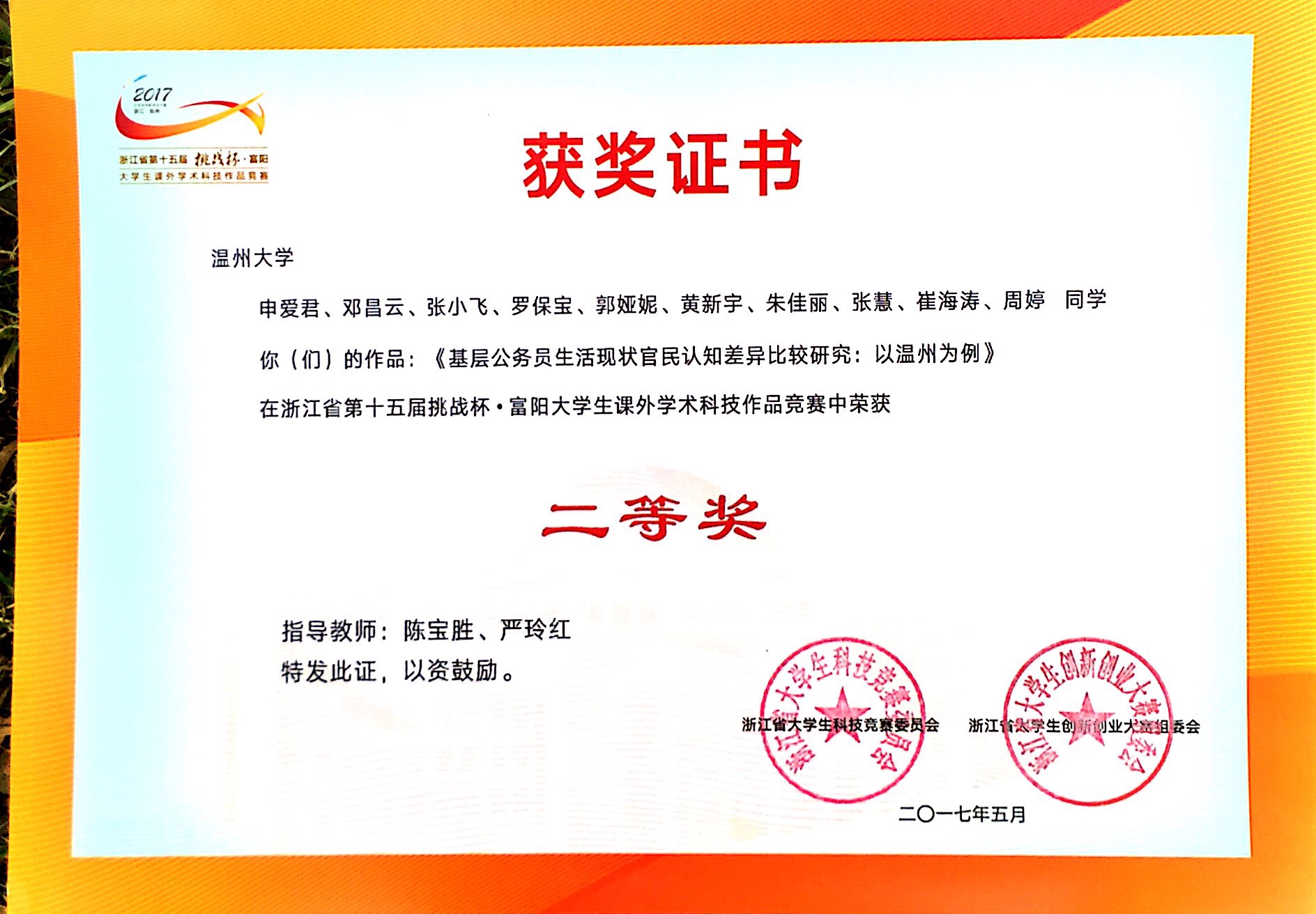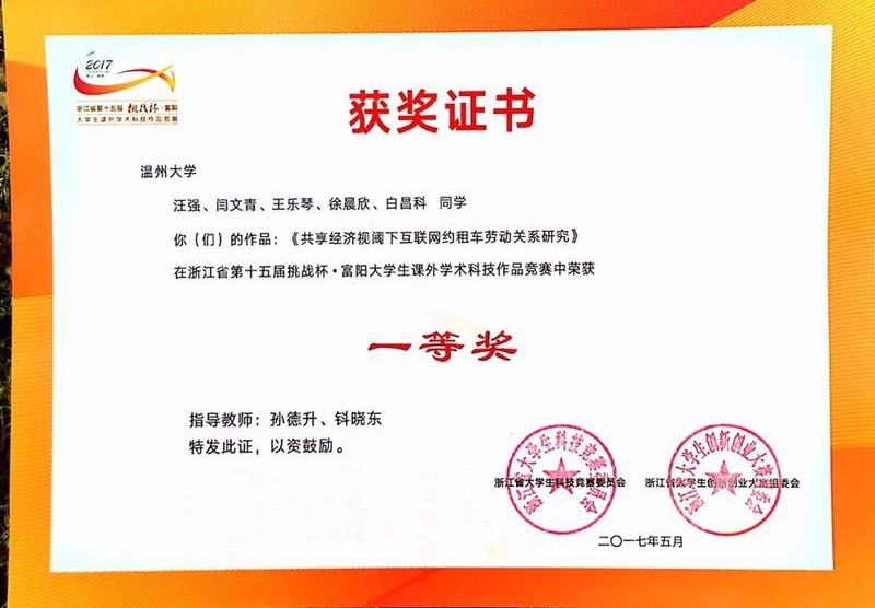 5月19日到21日,在由共青团浙江省委、浙江省教育厅、浙江省科学技术协会、浙江省学联和杭州市富阳区人民政府联合主办、浙江工业大学承办的浙江省第十五届"挑战杯"大学生课外学术科技作品竞赛决赛中喜获佳绩,其中麻将胡了试玩(中国)官方网站 汪强、闫文青、王乐琴、徐晨欣、白昌科等同学的作品《共享经济视阈下互联网约租车劳动关系研究》(指导老师孙德升、钭晓东)荣获决赛一等奖,麻将胡了试玩(中国)官方网站 申爱君、邓昌云、张小飞、罗保宝、郭娅妮、黄新宇、朱佳丽、张慧、崔海涛、周婷等同学的作品《基层公务员生活现状官民认知差异比较研究:以温州为例》(指导老师陈宝胜、严玲红)荣获决赛二等奖。