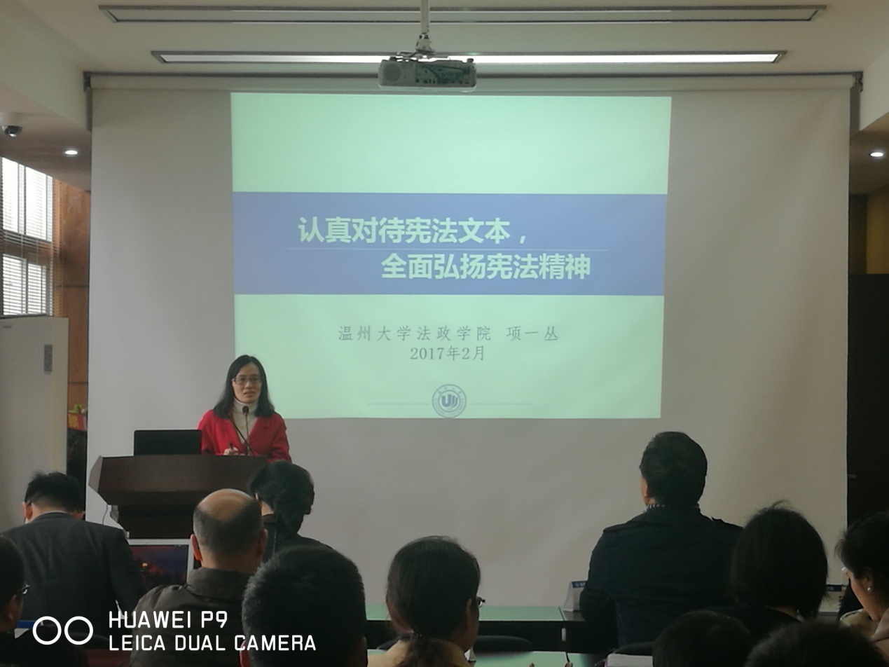 项一丛老师长期从事宪法教学,是省教育系统宪法讲师团成员之一,讲授的课程深入浅出,通俗易懂,深受师生喜爱。首先,我国的宪法语境由《中共中央关于全面推进依法治国若干重大问题的决定》这一重要文件展开,通过宪法日、宪法宣誓制度、五四宪法历史纪念馆推广。其次介绍了我国宪法文本,宪法文本作为依宪治国和依宪执政的规范基础经历了历史变迁,为了更好地贯彻宪法,应该建立尊重宪法文本的文化,通过宪法适用强化宪法权威,谨慎对待宪法与改革的关系。最后,指出高校宪法教育的新任务,认真贯彻《青少年法治教育大纲》和《浙江省教育系统法制宣传教育第七个五年计划》重要文件。