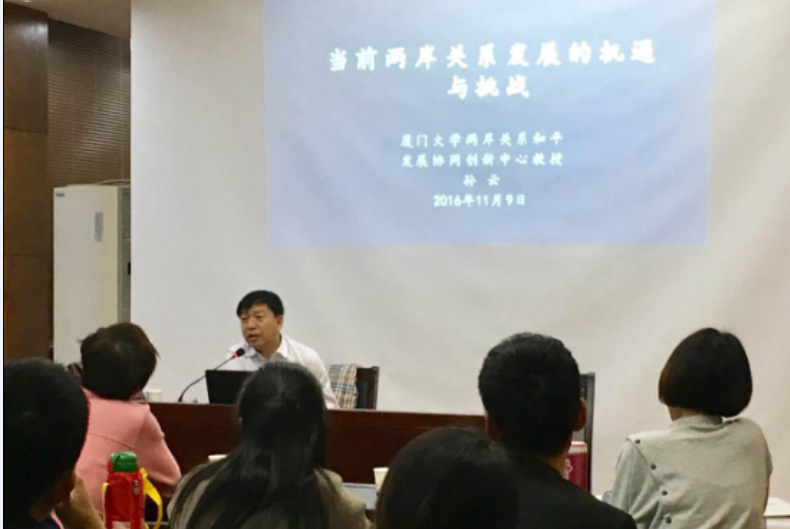 2016年11月9日,麻将胡了试玩(中国)官方网站 荣幸邀请到著名学者、厦门大学台湾研究院博士生导师、厦门大学两岸关系和平发展协同创新中心重大理论平台执行长孙云教授,就"当前两岸关系的机遇与挑战"问题,与本院师生进行学术交流。讲座在法政麻将胡了试玩 一楼报告厅举行,吴玉宗教授担任主持人,王勇副院长、付翠莲教授、徐旭东、朱婉菁等老师参加了此次学术活动。