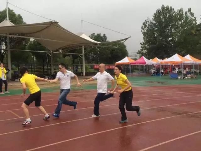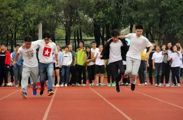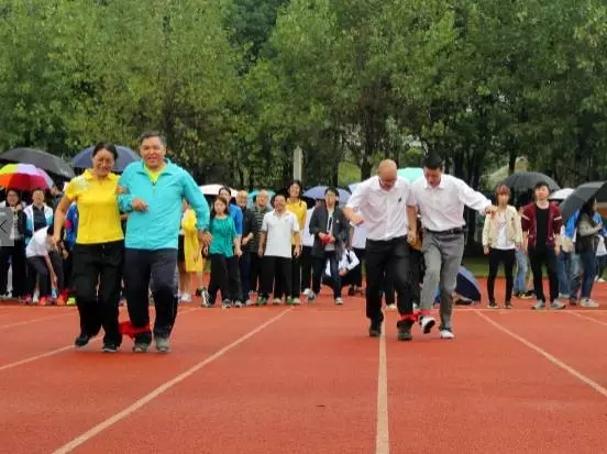 在两人三足的趣味项目中,老师们喊着口号,争先恐后地迈向前方,一旁的同学也忙着加油打气,热闹非凡