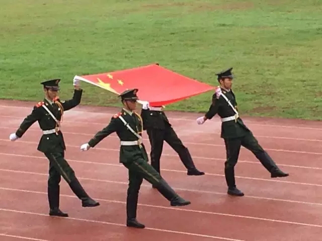 英姿飒爽的国旗护卫队庄严而来,铿锵有力的步伐振奋人心