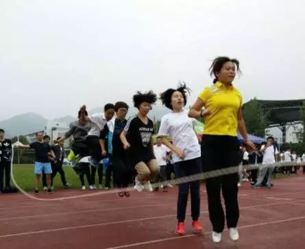 飘逸的头发,整齐的跳跃,同学们的团结在集体跳大绳