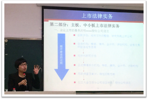 2016年4月19日星期二,我们迎来了由浙江大自然鞋业有限公司高级法务叶颖老师带来的我们期盼已久的以"上市法律实务"为主题的讲座。