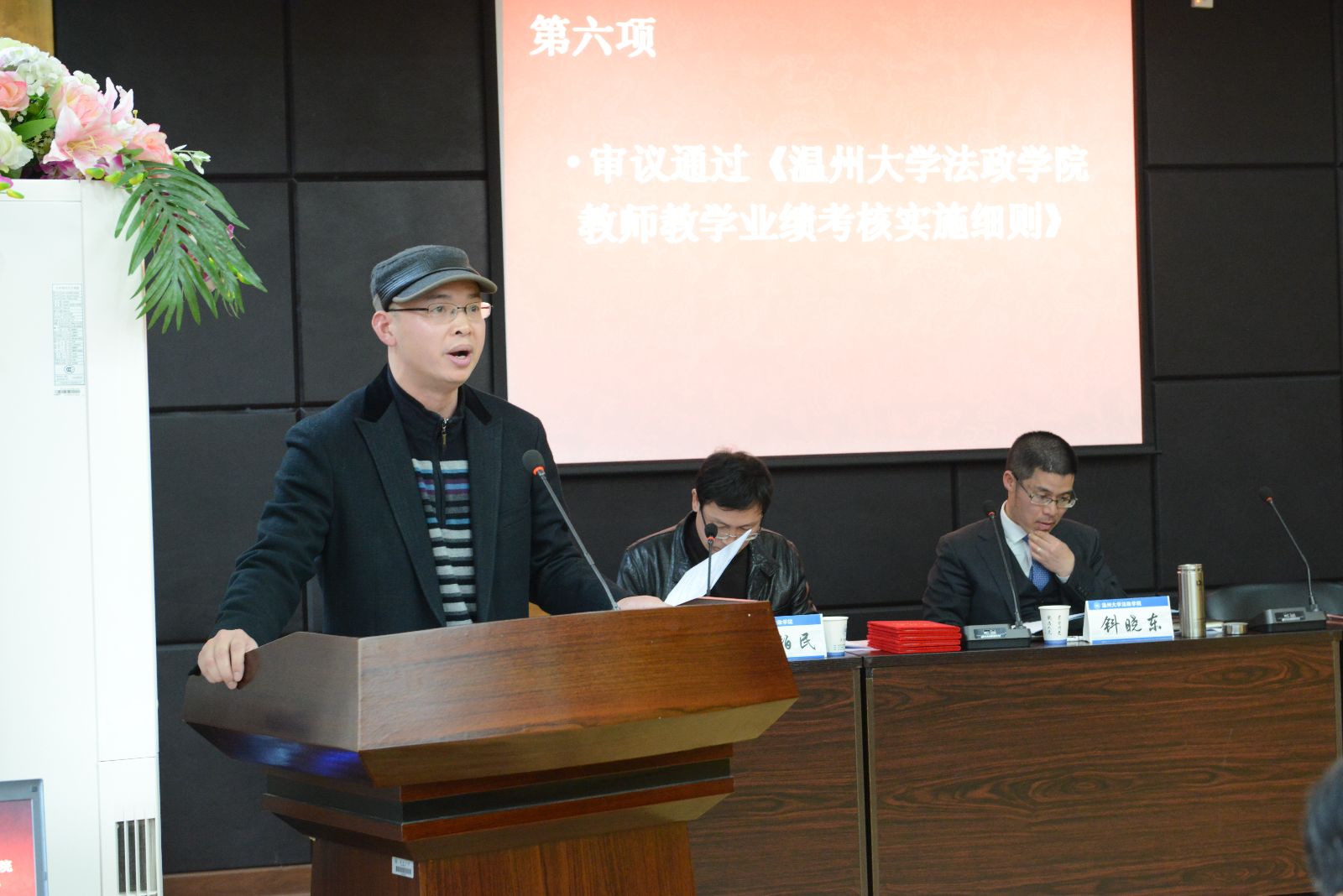 王宗正副院长对《《温州大学法政麻将胡了试玩 教师教学业绩考核实施细则(征求意见稿)》进行了简要的分析和说明。全体代表通过举手表决审议通过了麻将胡了试玩 教师教学业绩考核实施细则。