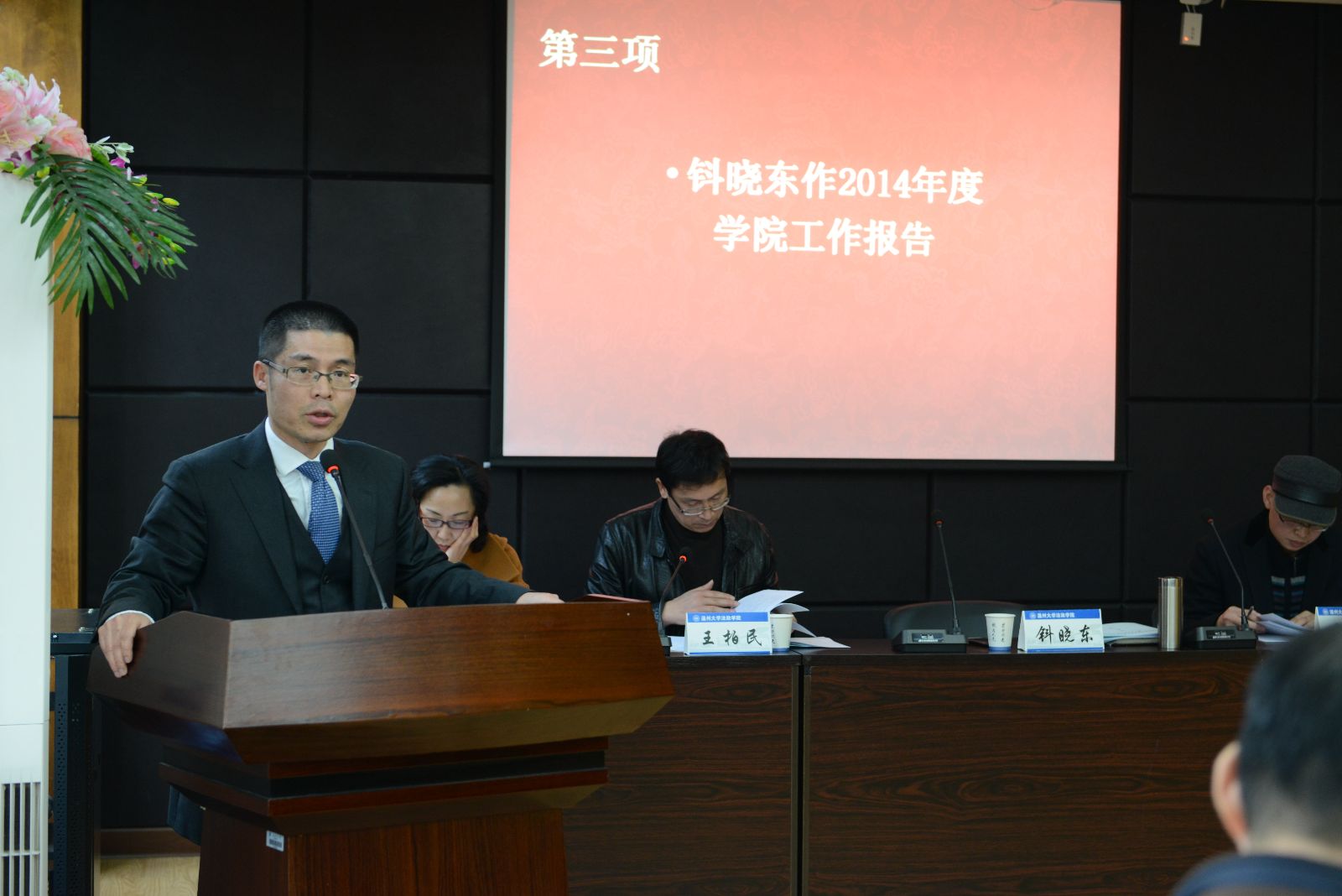 钭院长强调:面向充满希望和梦想的2015年,要进一步深化"利益共同体"意识,增进互惠互利效应;促进"麻将胡了试玩 -师-生"联动,推进"四位一体"发展机制;完善内部管理结构,优化二级治理能力;创新系列教学改革,提升人才培养质量;提升学科建设层次,促使学科建设更接地气;夯实"学工聚焦工程",推动"学生成长工程"; 强化党工与校友工作,营造麻将胡了试玩 共生发展氛围;推进党风廉政建设,加强廉政教育与监管。