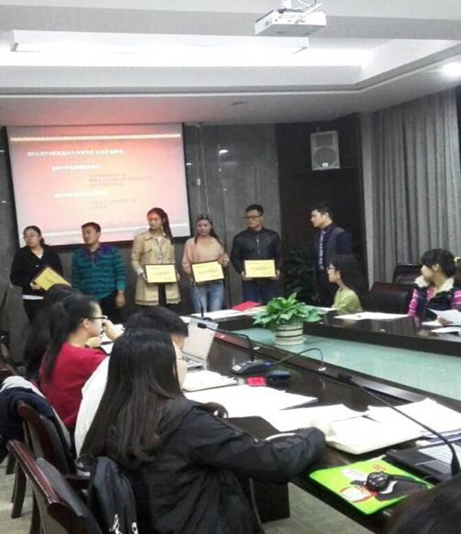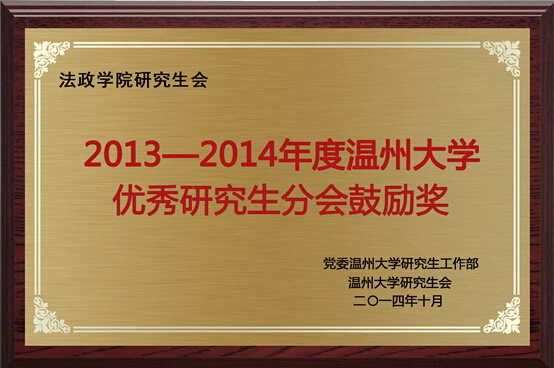 2014年11月27日感恩节之际,麻将胡了试玩(中国)官方网站 研究生会成员李根雪代表法政研会出席了校研究生会组织的温州大学第三届优秀研究生分会的颁奖典礼。麻将胡了试玩(中国)官方网站 研究生会荣获2013-2014年度"优秀分研会鼓励奖"光荣称号。