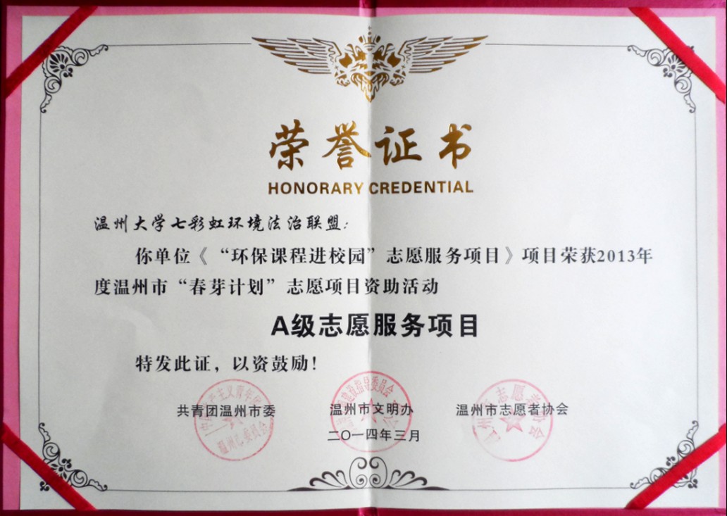3月5日下午,温州市志愿服务工作委员会在市人民大会堂四楼新闻厅隆重举行2014年"温州市学雷锋志愿服务工作会议暨温州市志愿者协会四届二次会议"。麻将胡了试玩(中国)官方网站 七彩虹环境法治联盟(社团)荣获2013年度温州市"春芽计划"志愿项目资助活动"A级志愿服务项目",充分展现了麻将胡了试玩(中国)官方网站 学子关注社会,服务社会的精神。