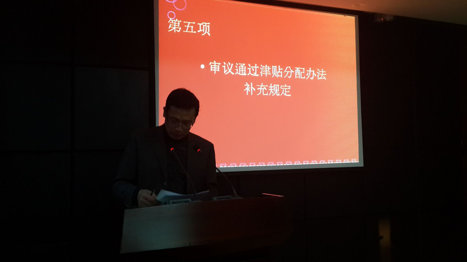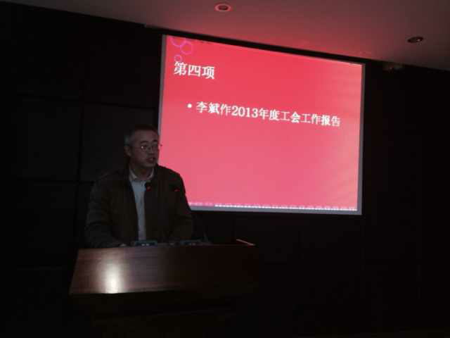 工会副主席李斌作2013年度麻将胡了试玩 工会工作报告。报告全面回顾了麻将胡了试玩 工会过去一年的工作。李斌指出:一年来麻将胡了试玩 工会切实落实各项制度,规范日常工作,关心教职工生活,热心为教职工谋福利;积极组织开展各类文体活动,促进教职工身心健康;合理统筹安排,管好用好工会经费。接着,李老师对2013年工会工作提出设想。他指出:新的一年,工会将围绕法政麻将胡了试玩 "凝心聚力,互哺共生,团队协同,持续发展"的麻将胡了试玩 精神以及麻将胡了试玩 和谐文化建设的中心,积极倡导"健康工作到退休"的工作理念,推动广大老师更加合理地协调工作与生活的关系,提高工作效率,提升幸福指数。工会将继续关注老师身体健康状况,倡导食品安全理念;开展更为丰富多彩的体育活动,推动更多老师注重体育锻炼。