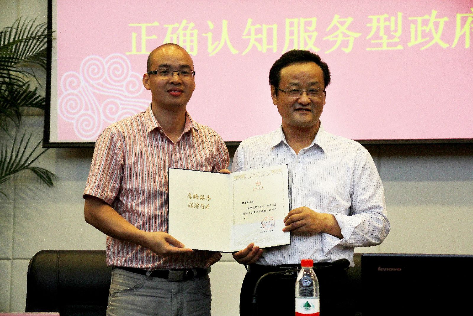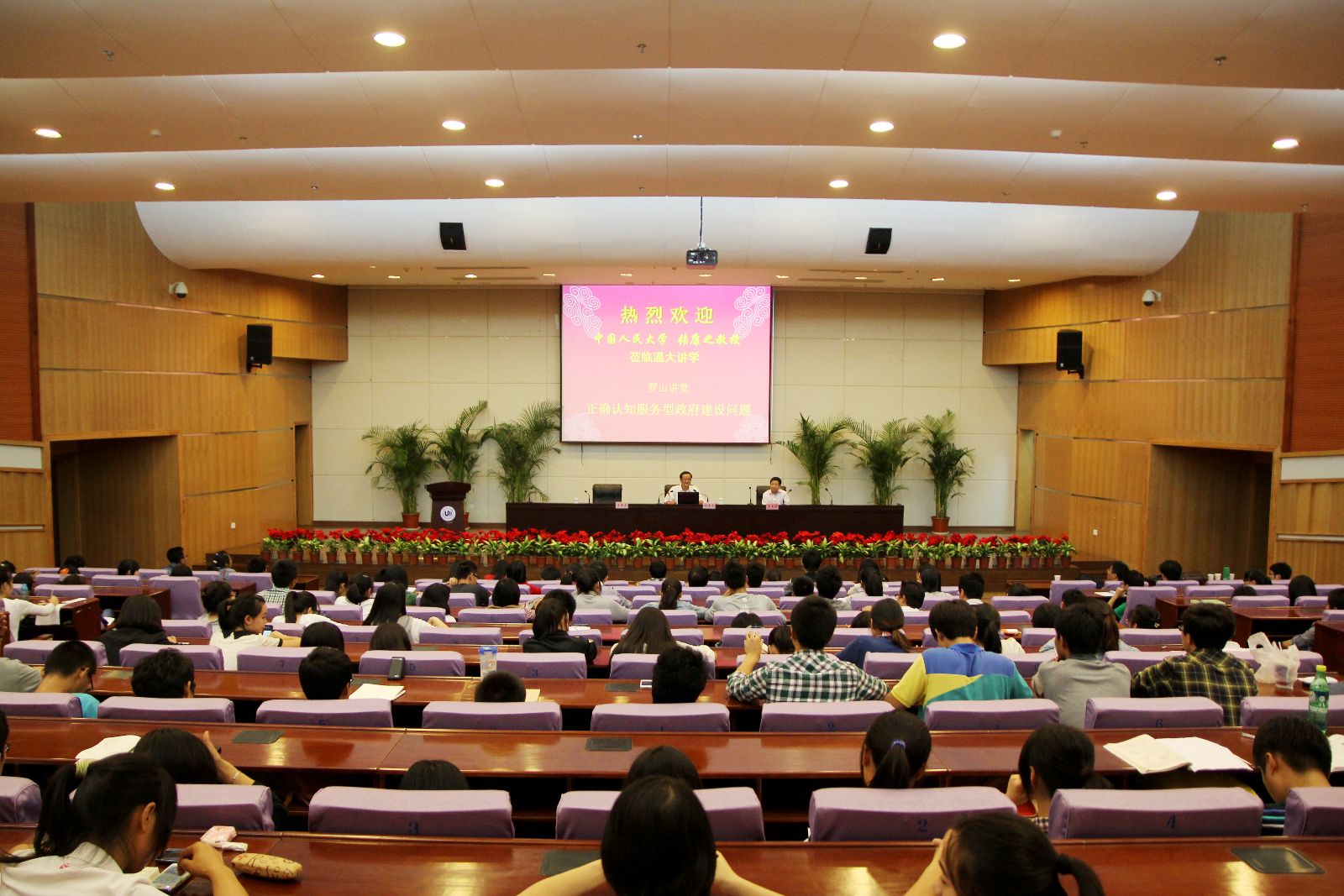 在简短的聘任仪式后,张教授开始了精彩的学术演讲。通过中国政府机构改革的历史回溯,张教授将我们引入了农业社会、工业社会、后工业社会的宏观语境中,向我们展示了农业社会、工业社会、后工业社会的特定历史特点及所需对应的政府管理结构和管理模式,证明了政府管理模式变迁对社会发展的重要意义,进而指出中国政府探索服务型政府建设的积极作用和历史意义,认为服务型政府是后工业社会对政府管理模式的必然要求,也是中国未来发展的关键引领和推动力量,实际上肯定和描绘了中国未来发展的美好前景,带领我们从时代背景和历史发展趋势的宏观视野来正确认识服务型政府建设问题,为聆听演讲的师生呈现了一场学术盛宴。
