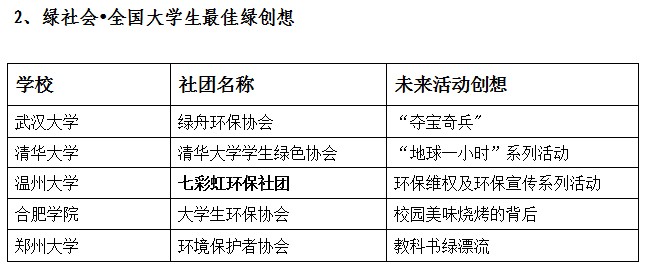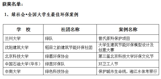 在活动中,麻将胡了试玩(中国)官方网站 七彩虹环保社团(七彩虹环保法治联盟)荣获"绿社会•全国大学生最佳绿创想"奖。此次在全国各高校环保社团提交的方案中共评出5个"绿社会•全国大学生最佳环保案例"奖和5个"绿社会•全国大学生最佳绿创想",获奖名单如下:
