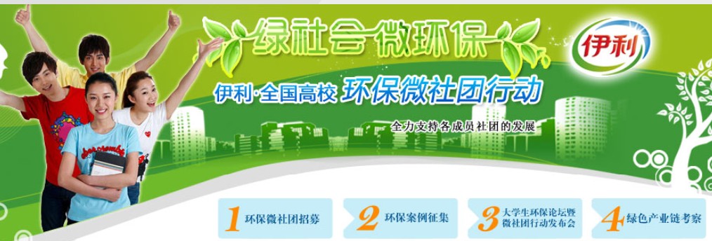 由中国青年报社与伊利集团共同举办的"绿社会•全国大学生环保案例及创意征集"活动于2012年8月31日正式截止,此活动面向全国各高校环保社团征集最优秀的环保实践行动和环保梦想。征集活动得到了全国高校环保社团的积极响应,参与高校覆盖北京、天津、上海、广东等17个省市地区。