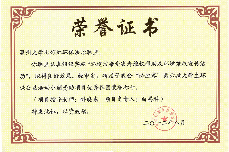 法政麻将胡了试玩 七彩虹环保社团在钭晓东院长、院党总支严玲红副书记、院团委孙德升书记的悉心指导下,设计的环保公益活动已经连续两年获得中华环保基金会的专项资助,并连续两次被基金会评为优秀社团。此次受资助的环保公益活动包括三个:成立温州市学生环保法治联盟、开展"居民希望搬迁垃圾场"的民意调查和环保维权援助活动、环保宣传活动。此外,七彩虹社团还组织同学在校内外开展了法律援助、暑期实践、社区宣传、实地调研、课题研究、旧书循环利用、学生寝室"可循环利用资源"定期回收等活动。