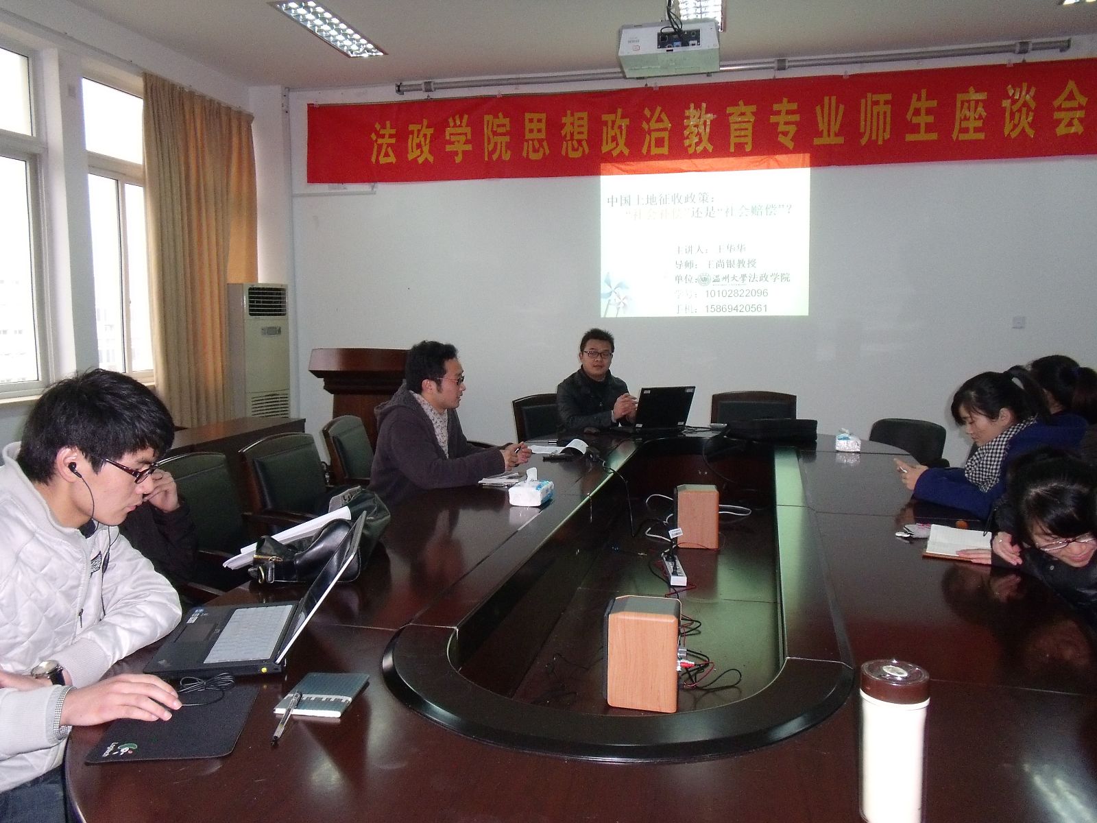 "文以载道,经世致用","好文章好在点子上",而观点创新源于思想交流与碰撞。为促进法政研究生学术交流与科研创新,法政研究生会于2012年3月6日成功举办了2012年"温州大学·2010级·法政研究生·学术沙龙"第四期活动。本次学术沙龙由法政研究生会主席丁强主持,2010级、2011级马克思主义基本原理、政治课程论专业研究生前来参加沙龙。