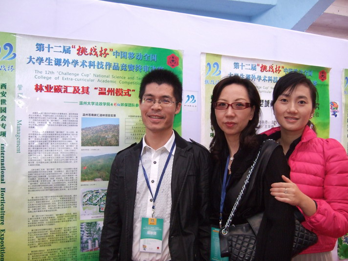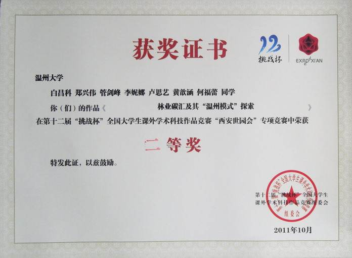 2011年10月15日至19日,第十二届"挑战杯"全国大学生课外学术科技作品竞赛终审决赛在大连理工大学举行,麻将胡了试玩(中国)官方网站 的挑战杯项目《林业碳汇及其"温州模式"的探索》,在白昌科、郑兴伟等同学组成的"七彩虹"团队、指导老师钭晓东教授、欧阳恩钱副教授的共同努力下,经过长期的跟踪调研论证,获得"西安世园会"专项竞赛二等奖,取得我校在该项赛事上的突破。