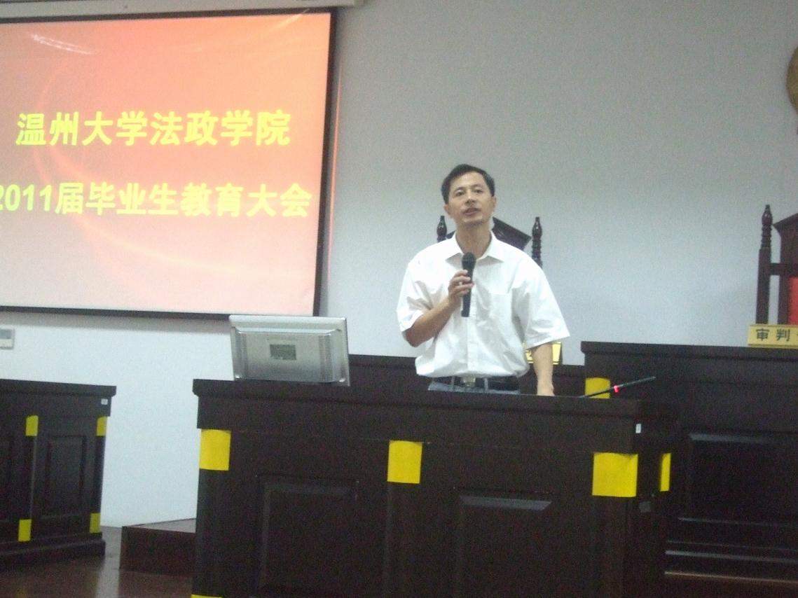 在北校区模拟法庭隆重召开2011届毕业生教育大会。院长方益权、院党总支副书记严玲红、毕业班班主任李斌、辅导员孙德升和孙慧,以及2011届全体毕业生参加了会议,会议由学生科科长杨振海主持。