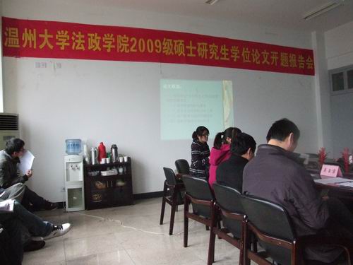 上午8时30分,开题报告会在法政楼309教室举行。开题报告会由硕士点负责人 报告上,研究生逐一将选题的目的、意义、研究现状、研究思路与方法、论文框架、创新与不足之处等方面向各位评议组专家作了全面的陈述;评议组成员则一一就报告内容的各个方面做出了详尽而深入的点评,既尖锐地指出了问题,也中肯地提出了建议,使参加开题的硕士研究生备受启发,使其对今后的研究方向及研究重点更加明确。同时,报告会也促发了低年级同学对钻学问、做研究的深层次思考。