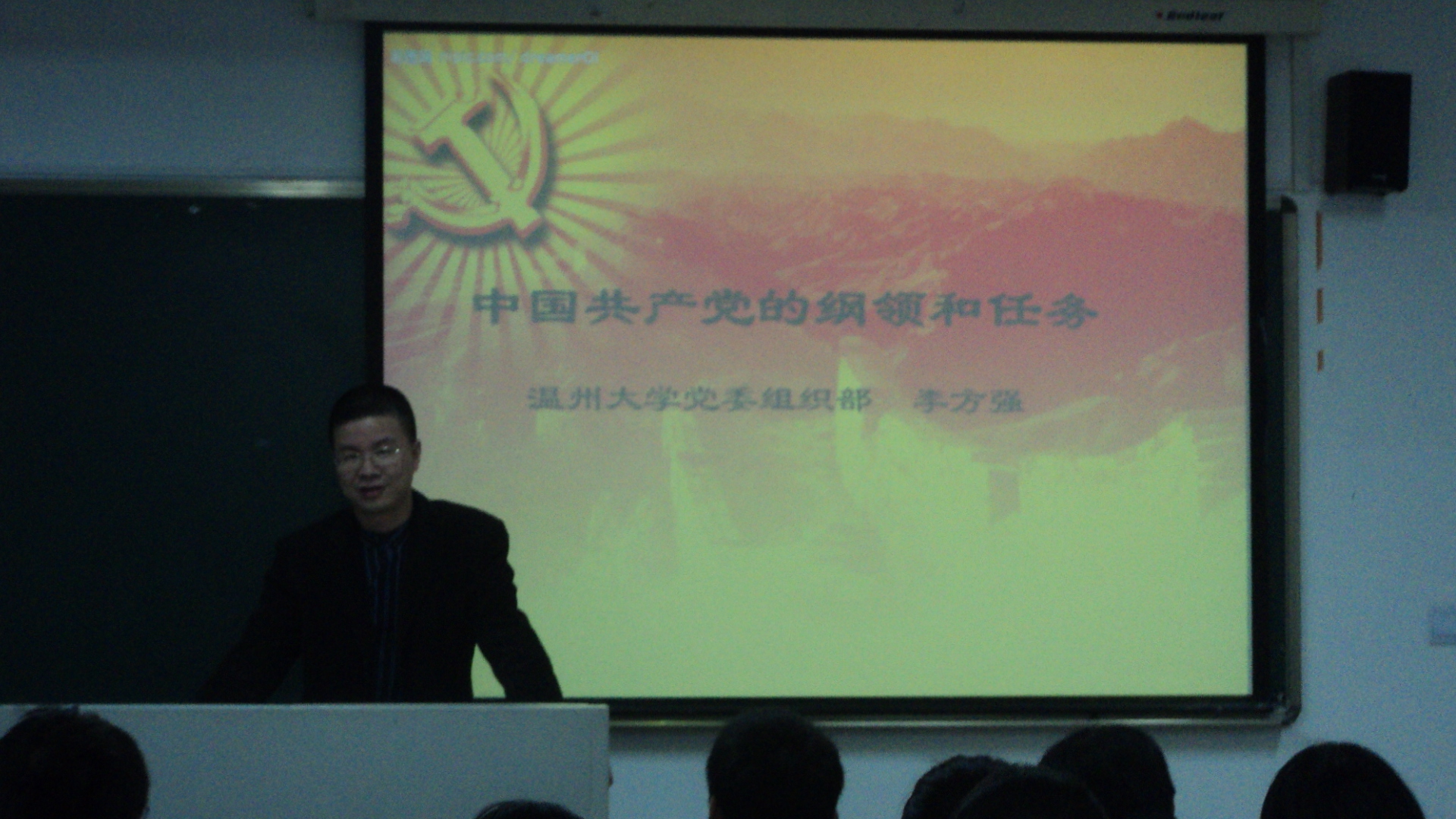 首先,学生党建指导老师杨振海宣布培训班开班,介绍了本学期入党积极分子班培训计划及学习内容,并要求同学们认真上课,遵守党课纪律。其次,杨老师老师向同学们介绍了主讲第一课的温州大学党委组织部副部长李方强老师。李老师从"什么是党的纲领"、"中国共产党的最高纲领"、"中国共产党的最低纲领"及"中国共产党的最高纲领和最低纲领的关系"等方面详细具体的介绍了中国共产党的纲领和任务。课上同学们仔细听,认真记,积极参加讨论,增强了对我党纲领和任务的认识。讲座后,李老师对在座的入党积极分子提出了几点希望与要求,希望同学们不断提高政治思想觉悟,明确和端正自身入党动机,为早日加入中国共产党做好积极的思想准备。