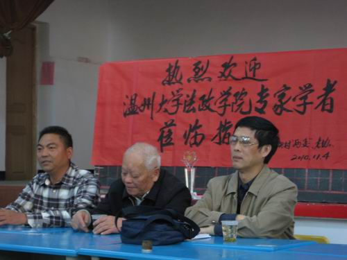 师生一行受到珊溪镇领导、街头村两委和老年协会的热情接待。在街头村老年协会活动室,村镇领导、老协负责人与来访师生开展了有关孝文化的座谈会。座谈会上,街头村孝文化建设负责人介绍了街头村的孝道文化渊源,开展"孝顺子孙"等评选活动的相关组织制度建设,开展孝文化建设以来取得的效果以及街头村孝文化的传播和影响;接着,姚周辉教授发表了自己对孝道文化传承与建设的几点看法,随后研究生同学针对孝文化对新农村建设、和谐社会构建的重要意义以及街头村孝文化的再建设与再传播等问题与村镇、老协领导展开了互动与交流;继而,法政师生参观了街头村孝文化展览馆。