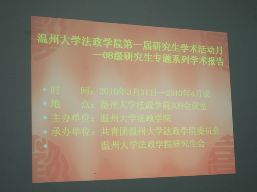 会议伊始,本次报告会的两位同学08级研究生徐天兰、周敏分别作了题为《温州市社会中介组织发展对政治民主化的影响》和《现阶段私立学校面临的困境及其出路》的专题学术报告,李业杰教授、李治国教授、王尚银教授进了行点评。在报告结束后的互动环节各年级研究生、同学们就两位同学的学术报告积极提问、热烈讨论。 会议最后,姚周辉副院长做了精彩讲话,肯定了为期一个月以来的学术报告会取得的成绩,指出了尚待改进的不足之处,同时也对麻将胡了试玩(中国)官方网站