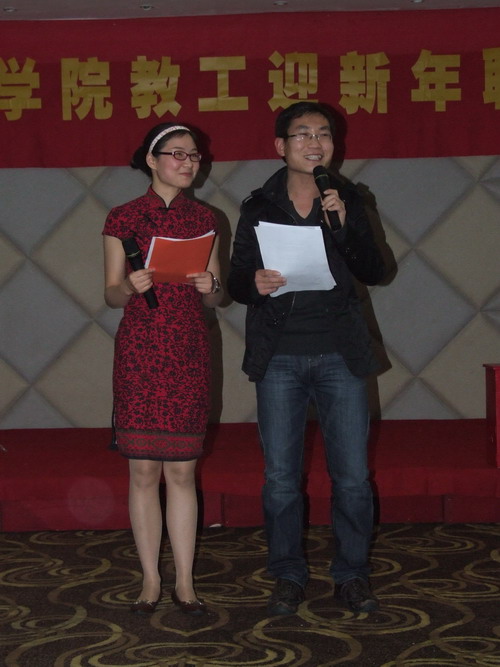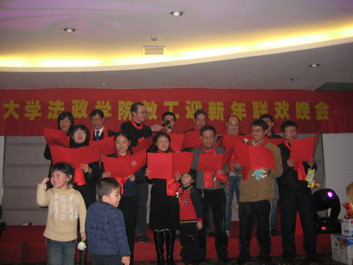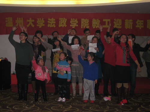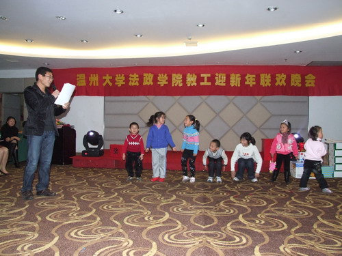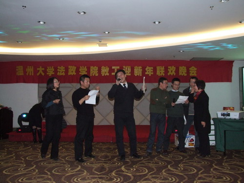 的传统。在2008年的最后一天,我们带着兴奋和期盼的心情在红太阳宾馆举行了迎新年联欢晚会。 晚会首先由蔡克骄院长作新年致辞,在孙德升和孙慧两位主持人的引领下,精彩节目和游戏陆续登场,掀起一个又一个的高潮。去年迎新年晚会的精彩回顾让我们回想起去年的美好记忆,全场禁不住开怀大笑;余惠老师深情演唱了《前门情思大碗茶》,赢得一片掌声;政治与原理组的老师们用各地方言演绎了由李业杰教授创作的《花》,构成了精彩的节目《南腔北调说"花"》;概论与纲要组的教师们为全院教工献上了衷心的《祈祷》;法学组的全体教师用黑色毛衣、红色围巾的统一着装和饱含情感的声音阐释了《面朝大海 春暖花开》;行管与基础组的老师们合唱了一首《感恩的心》,并配上了手语,成为了晚会的又一亮点;小朋友出色的表演也给晚会添上了浓浓的亲情色彩;游戏《疯狂大搜集》则把现场的气氛推向了最高潮。陈安金、余增荣等校领导也应邀参加了晚会,并纷纷表演了自己的拿手好戏。晚会现场欢笑声、喝彩声不绝于耳,洋溢着浓浓团结友爱的氛围和节日的喜庆气氛。 让我们期待着明年的相聚,让我们共同祝愿2009年的法政麻将胡了试玩 将更加美好!