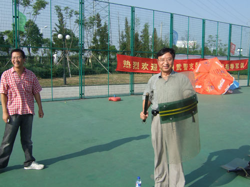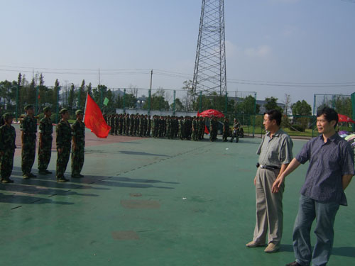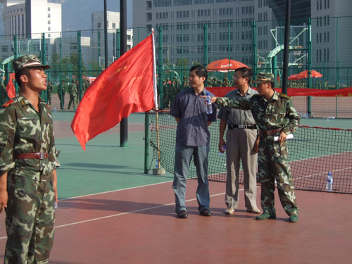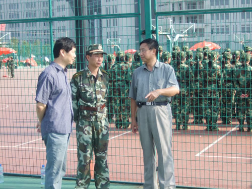 蔡克骄院长、陈国治书记安排好手头的工作,在学生科科长杨振海和辅导员孙德升的陪同下专程赶到南校区运动场看望烈日下照常训练的法政新生和教官。