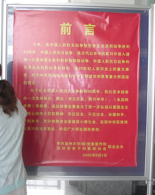 9月8日下午1时许,法政麻将胡了试玩 全体学生党员在第一支部书记杨振海老师的带领下,前往行政楼一楼大厅参观了由李方华老师组织的纪念抗日战争胜利六十周年大型邮票展。 据了解,此次邮票展的所有作品是李方华老师的个人收集,他为了本次展览,特意花了三、四个月的时间来整理,分别有《毋忘历史,振兴中华》、《永远的丰碑》等多组不同的主题。 在参观过程中,李老师认真地为我们讲述了抗日英雄们的英勇事迹。通过他的描述,我们了解到革命前辈们面对凶残的敌人是如何地顽强抗争,他们是如何在恶劣的环境下坚持共产主义信念不动摇;他们的事迹感动了我们,同时也让我们明白了加强爱国主义教育和坚定爱国主义信念的重要性所在。 (通讯员:高文丹 上官维华) 附图:
