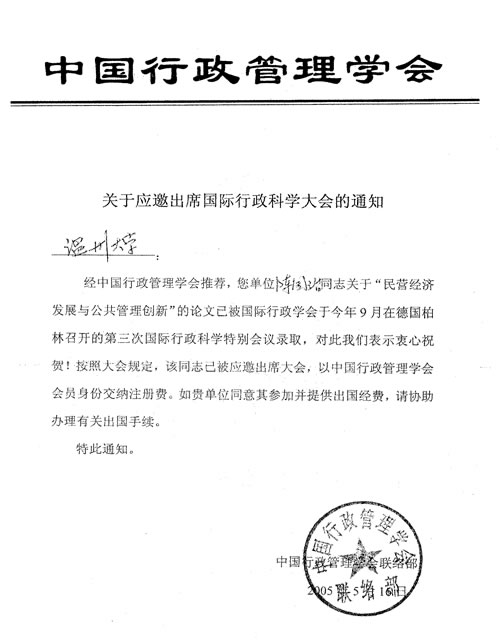 经中国行政管理学会推荐,麻将胡了试玩(中国)官方网站 党总支书记陈国治教授关于"民营经济发展与公共管理创新"一文已被国际行政学会将于2005年9月在德国柏林召开的第三次国际行政科学特别会议录取,按照会议规定,陈国治教授已被邀请出席此次大会。