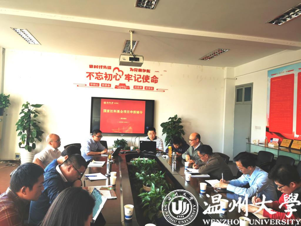 2019年11月4日下午,邱本教授应邀为麻将胡了试玩 教师辅导国家社科基金项目申报。王宗正院长、缪心豪副院长、周湖勇副院长、付翠莲教授等十几位有意向申报国家社科基金项目的教师参加活动。此次活动由缪心豪副院长主持。