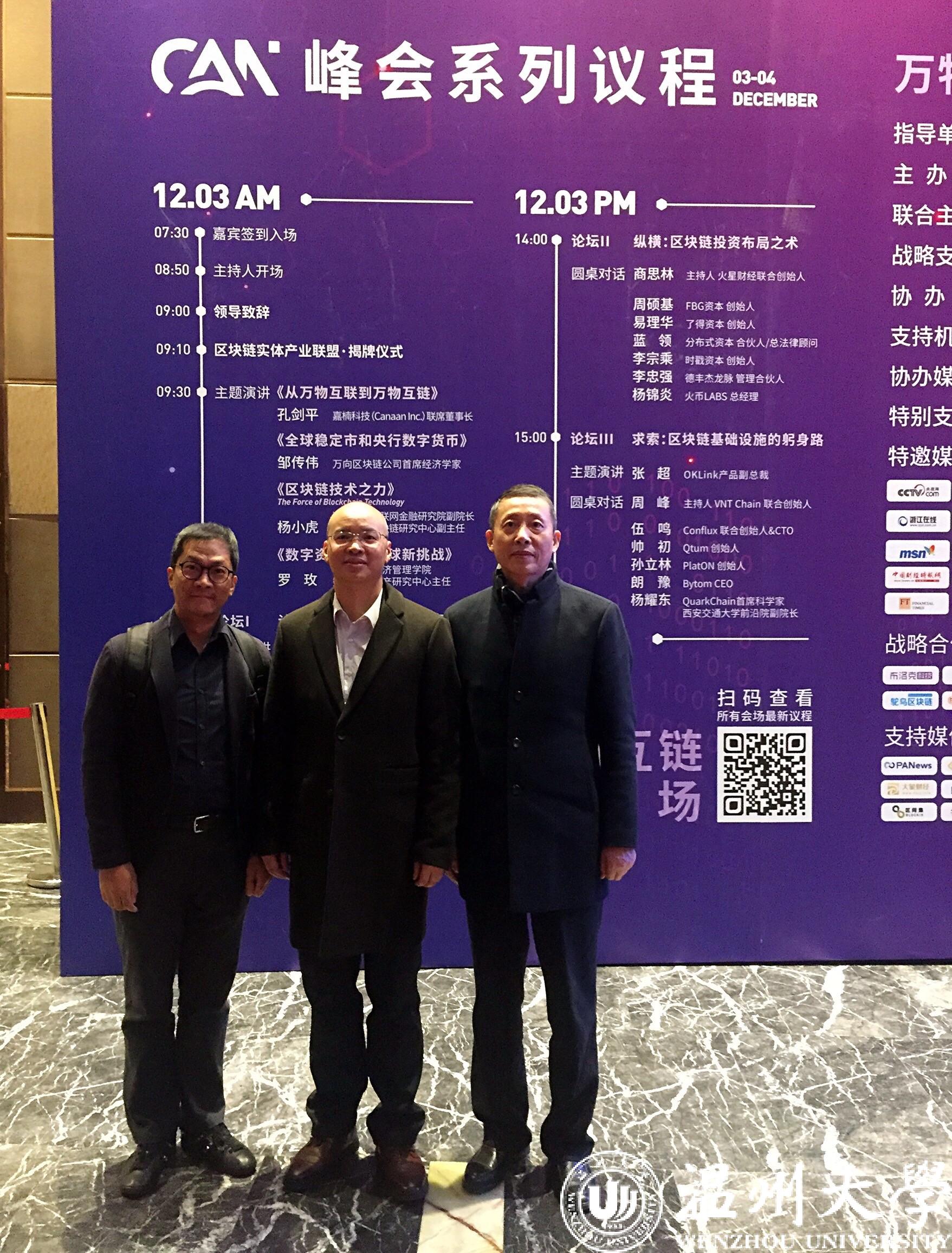 12月3日,麻将胡了试玩 院长王宗正、党委书记林钦、副书记杨振海一行,受杭州嘉楠耘智信息科技有限公司联席董事长孔建平(系麻将胡了试玩(中国)官方网站 2008届法学专业优秀校友)邀请参加2019CAN大会·万物互链·区块链与全球经济新格局峰会。此次大会由杭州市人民政府为指导单位,CAN大会组委会联合嘉楠科技和浙江清华长三角研究院杭州分院主办。本届大会以促进区块链技术革新、产业变革、生态协同发展为宗旨,引领经济创新、转型升级。大会邀请了近百名政府领导、业内著名专家学者、行业权威、投资机构和上市公司嘉宾。会上,杭州嘉楠耘智信息科技有限公司联席董事长孔建平受邀作《从万物互联到万物互链》的主题演讲。