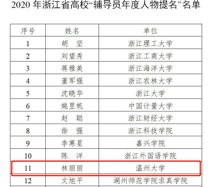 近日,浙江省高等教育学会思想政治教育研究分会公布了2020年浙江省“高校辅导员年度人物”选树活动评选结果,麻将胡了试玩(中国)官方网站 林丽丽老师喜获“2020年浙江省高校辅导员年度人物提名”奖。