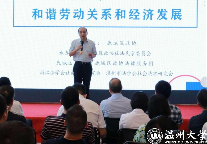 鹿城区政协主席徐强参加活动并讲话,徐一峰副主席致辞,康奈集团党委书记、工会主席蔡发荣等企业代表参会。浙江省法学会社会法学研究会副会长兼秘书长、温州大学副院长周湖勇博士参会,并作了《疫情下的劳动关系治理》,提出要树立劳动者合法权益与促进企业生存发展权并重的理念,依法保障劳动者和用人单位合法权益,促进劳动关系和谐稳定,不能简单地应用对劳动者倾斜保护、实质公正的理念和原则来处理劳动关系,并需要采取一系列特殊举措。省社会法学研究会理事、温州市中级人民法院黄百隆、温州市律协劳动专委会主任陈琨、康奈集团党委书记、工会主席蔡发荣等也做了主题发言。
