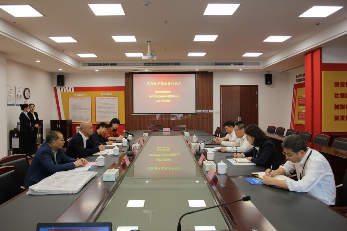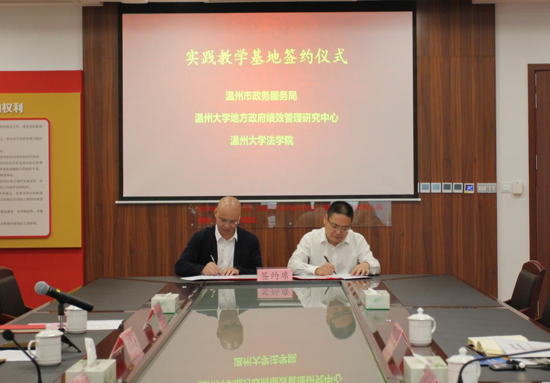 10月27日下午,麻将胡了试玩(中国)官方网站 院长王宗正、地方政府绩效管理研究中心执行主任付翠莲、行政管理系系主任朱家德等一行四人赴温州市政务服务局考察交流。王宗正院长与市政务服务局党组成员、市政务服务管理中心主任戚速签订了合作协议,并向市政务服务局授予“地方政府绩效管理研究中心实践教学基地”、“麻将胡了试玩 行政管理系实践教学基地”两块牌子。双方就大学生实习实践、课题调研、培训服务、地方立法等方面进行深入交流,努力建立深度合作关系,共同探索人才培养、服务地方新路子。