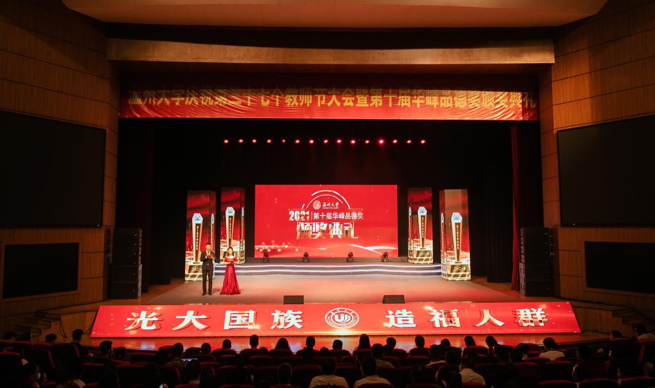 教师节当天,温州大学举行第十届“华峰品德奖”颁奖大会。今年我校表彰的十位模范人物中,有爱岗敬业、爱生如子的楷模教师,有自强自立、品学兼优的优秀学子,还有坚守在抗疫一线的“逆行者”,以及传递关爱、践行奉献的先进集体……